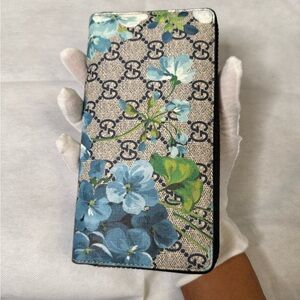 Chic Gucci wallet with vibrant floral design. Features blue and green tones. Stylish and versatile accessory.