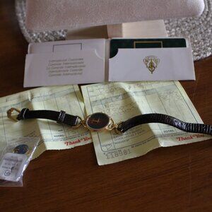 I bought this new about 30 to 35 years ago.  It is in EXCELLENT condition. I am the original owner.  I did have to have the movement replaced, had the watch serviced, new band and new battery.  WORKS FABULOUSYLY!!  With the service, movement, battery and leather band it cost me $160.   It is like a brand-new watch.  The crystal has one tiny scratch which I tried to show in my pictures.  I have all the brochures as you can see that came with it.  If you purchase it, I will send everything except for my yellow receipts because they have all my personal information.  You get everything else This is from a smoke free home. It has been stored for years in my jewelry box. Time for a new home.