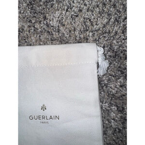 "This is a pre-owned Guerlain drawstring pouch, crafted from 100% cotton in an off-white or light beige hue. It features a gold bee logo above \"GUERLAIN PARIS\" on the front. The pouch has a drawstring closure with small tassels at each end. Measuring approximately 5.5 inches in height and 5 inches in width, it is made in China from recycled cotton fibers. The fabric shows a slight texture consistent with cotton material."