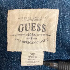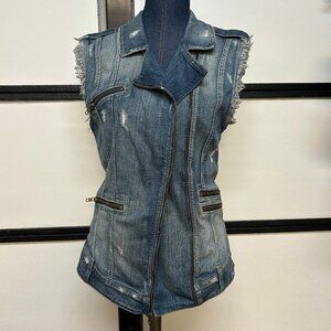 A women's Guess denim vest, in faded blue distressed fabric. Lower zipper on each side is a pocket, upper zippers are decorative. Epaulets on shoulder attached by buttons. Size fit is small, but has an oversized look. Seldom worm, very good condition.