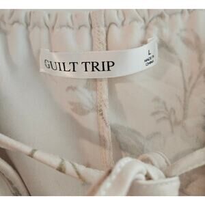 The Women's Guilt Trip Summer Shirt in size Large is a stylish and trendy blouse designed for women. This beige shirt is perfect for a casual yet fashionable look, featuring a juniors size fit that is flattering and comfortable. The guilt trip brand adds a unique touch to this wardrobe essential, making it a standout piece for your summer collection.