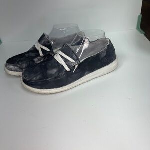 Casual slip-on style shoes featuring a dark tie-dye/washed black canvas upper and contrasting white laces. They have a lightweight, flexible white sole and a relaxed, comfortable design. The shoes include soft inner lining for added comfort and are displayed with clear inserts to show structure. Great for everyday wear with a laid-back, easygoing look.