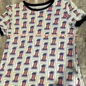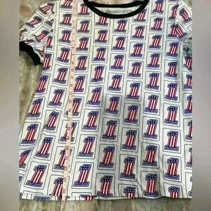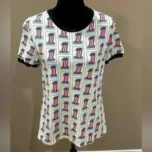 Women’s Harley Davidson all over print #1 American flag logo short sleeve top- Size large. Rare find! Excellent condition. See all photos, including measurements. No stains, tears, flaws. Smoke free gone. Fast shipping!