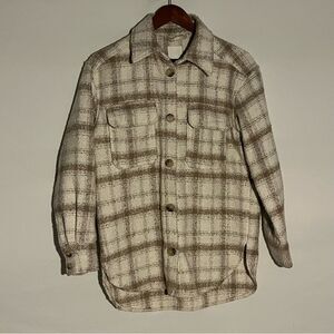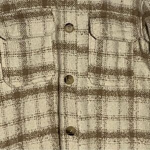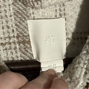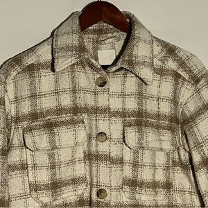 The H&M Women's XS Cream & Tan Plaid Shacket is a versatile and stylish addition to any wardrobe. This long sleeve button-up features a collared neckline and casual sleeve type, making it perfect for casual occasions in the winter, fall, or spring. The beige color with a plaid pattern adds a classic touch to the top, while the added feature of pockets adds functionality. Made of regular fit and with a brand like H&M, this shacket combines comfort and style effortlessly for a trendy look.