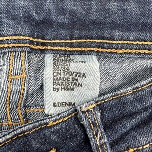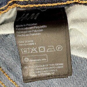 These super skinny jeans by H&M are crafted from a blend of cotton and elastane, offering a snug fit that stretches with your movements. The deep blue wash exudes a timeless elegance, while the classic five-pocket design ensures practicality. Ideal for those who cherish both style and comfort in their wardrobe.