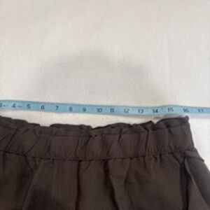 Pre-owned H&M women's pants, size US 12, made in China. The dark brown pants are crafted from a 55% linen, 45% viscose blend. Measurements: Waist 32", Inseam 26". Features include a drawstring elastic waist, two front pockets, and a relaxed fit. The pants show no significant flaws or damage; they appear to be in good condition. See pictures