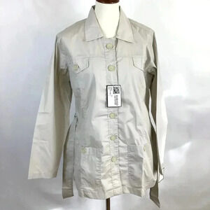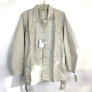 Classic, versatile piece by Haband in women's size large. Left and right breast mock pockets, patch pockets at hips on both sides, too. Sash-style belted waist and princess seaming to create a more flattering feminine silhouette. Collared.