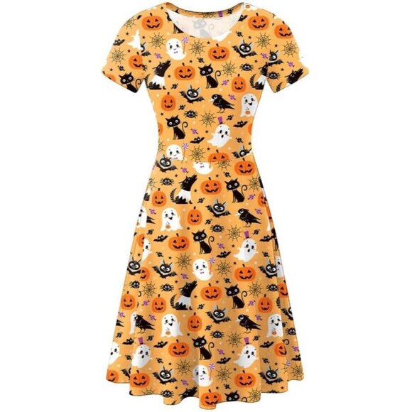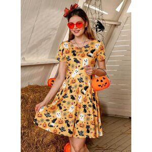 Women's Halloween Dress for Women Short Sleeves Printed Vintage Style Pumpkin