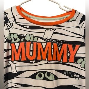 Featuring a playful 'MUMMY' design in vibrant orange and classic black, seafoam green & white. these pajamas are perfect for a cozy night in. Soft and comfortable, they are ideal for bedtime or lounging. Women’s 2 piece pajama set. Neck, cuffs& bottom of pj’s are ribbed in orange. Top & bottom are both size Medium (8-10) by Celebrate Halloween. 95% poly 5% spandex.