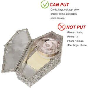 ●Size & Capacity.● This is a Magnet closure evening bag. Color: Silver. Dimensions: L7.48 x H2.36 x W4.33 inches, about 19x 6x 11cm. It has a small capacity, can NOT hold a cell phone, but it can hold keys, credit cards, lipsticks. Charming and dazzling appearance, about 1.83 pounds (0.83kg), maybe a litter heavy, but it's very special and eye-catching.