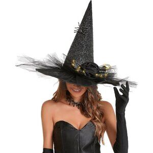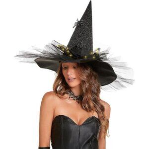 Women's Halloween Witch Hat with LED Lights Costume Gauze Feather Spider