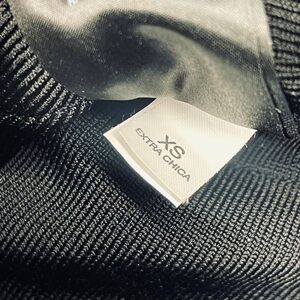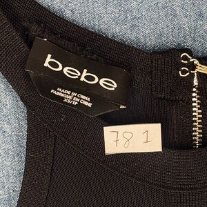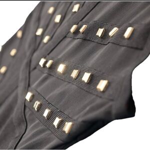 This sexy mini dress by bebe features a halter neckline with caging and studded details. The dress is sleeveless and made of a mesh fabric with a bodycon style, perfect for a party or cocktail occasion. It is designed in a gothic theme with gold accents on a black color base, in a size XS. Made of nylon, spandex, and rayon materials, this dress exudes a metal-inspired vibe.