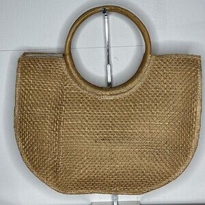 * Womens Hand Bag Tote Weaved Jute Floral Vase Design Wooden Handles Summer Beach