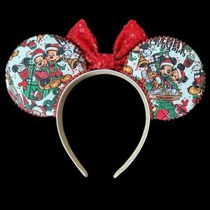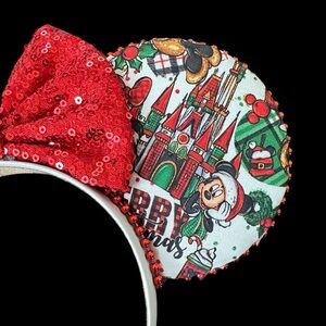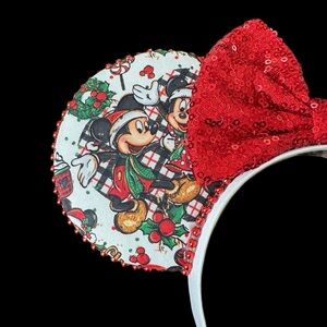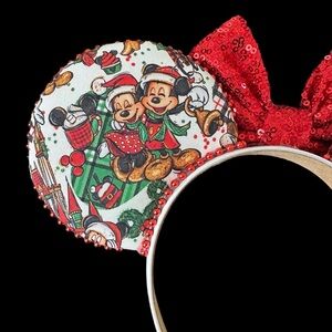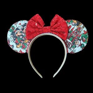 Festive mouse ears headband with a red sequin bow. Features a colorful holiday-themed design.