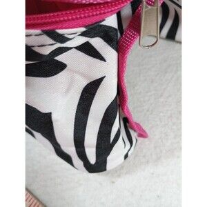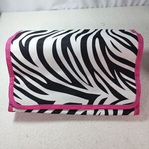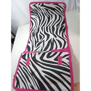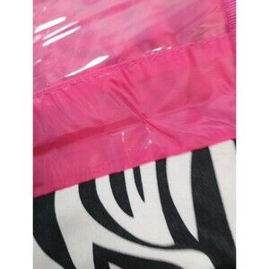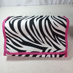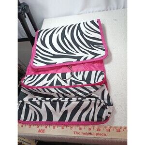 Chic and functional womens hanging toiletry bag with bold zebra stripe exterior and vibrant pink interior. Designed for travel convenience, this lightweight bag unfolds to hang for easy access to your essentials. Multiple compartments help keep toiletries, cosmetics, and accessories organized whether at home or on the go.