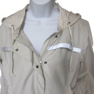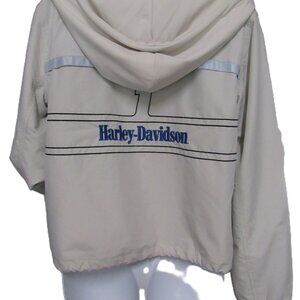 Good condition women's, out of stock, Harley Davidson #1 Racing Jacket with reflectivity in size medium. Waist and hood drawstring closures, front snaps and zips, welt hand warmer pockets with snap closures, vented front and back yoke, and extendable (tucked inside) thumb hole cuffs.