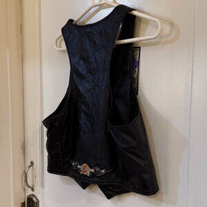 Women’s Harley Davidson leather riding vest, well cared for and in great condition. Soft, durable black leather with classic stitching and a stitched Harley patch along the lower back. Features a flattering cut, sturdy front zipper, and a timeless moto look. Strong, stylish, and ready for its next ride. Women's, medium size.