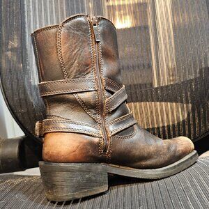 Harley Davidson distressed brown leather riding boots. Soles in great shape. Comfortable riding boot for walking in. Please note the distressed toe and heel with mild scuffing. No holes or rips.