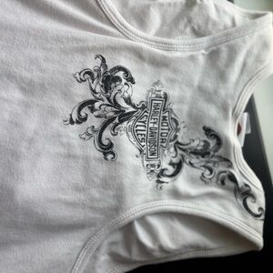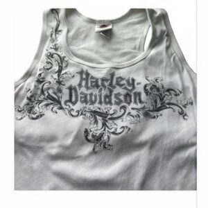 Ride in style with this authentic Harley-Davidson women’s tank top. Featuring a bold Harley-Davidson logo and ornate graphic print in black on crisp white, this sleeveless top is perfect for layering under a leather jacket or rocking solo in warm weather. A must-have for collectors and Harley fans alike!