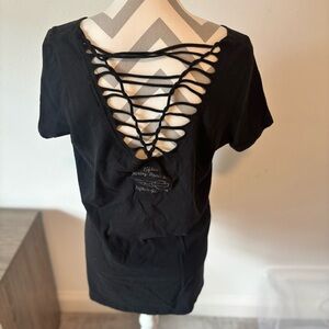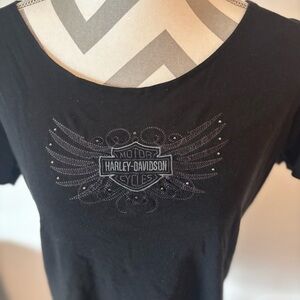 Harley Davidson lace-up back shirt, Harley women’s plus size biker top, studded graphic tee, black Harley shirt 2X, Harley Davidson wings logo shirt