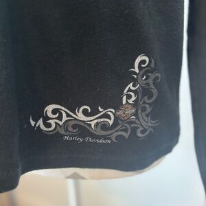 Classic Harley-Davidson women’s long sleeve in sleek black with silver-tone grommet button detail at the neckline. Subtle Harley scroll design near the hem adds a stylish biker edge. Perfect for layering under a jacket or wearing solo for a bold, casual look.