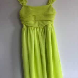 Neon yellow georgette (100% Polyester). A-line. Sleeveless. Square neck. Pull on. 37" from shoulder to hemline. Made in the USA of imported fabric.