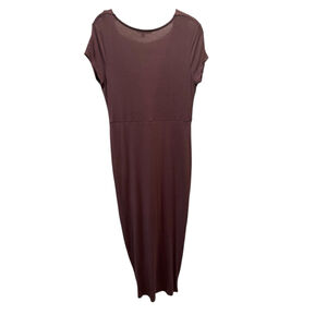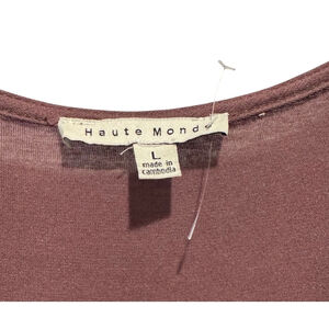 This is a Haute Monde dress, size Large, in new condition without tags or box. The dress is a solid brown color with a V-neckline and short sleeves. It features a twisted knot detail at the waist. The dress is made of a soft, stretchy material. The dress appears to be free of any visible imperfections.