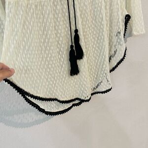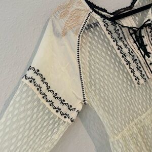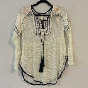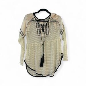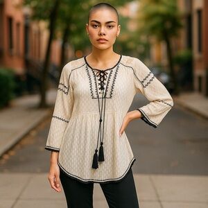 Beautiful boho-inspired blouse from Hazel for Anthropologie. Features a cream base with subtle tonal print, navy embroidered trim, lace-up neckline with tassel ties, and a flattering peplum-style fit. Lightweight and perfect for layering or standalone wear.