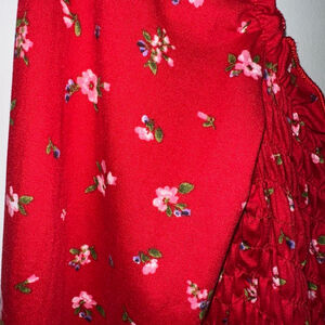 This pre-owned Heart & Hips top is a size Medium and made in China from 96% polyester and 4% spandex. It features a red base with a scattered floral print of pink and white flowers. The top has long sleeves with ruffled cuffs and a square neckline with a ruffled edge. The bodice is shirred, creating a smocked effect, and the hemline is also ruffled. No visible imperfections are noted in the provided images.