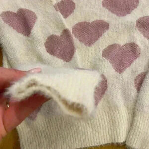 This is such a pretty and unique new with tags sweater. It is decorated with soft pink hearts, as well as pearls surrounding one of the front hearts. It is very soft and made of nylon and acrylic. It is an excellent condition and measurements are in the pictures. Thank you for considering my item. 💗