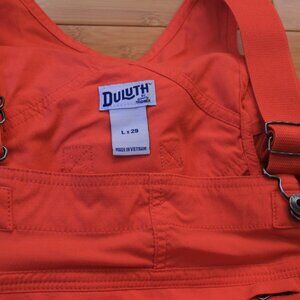 First, it is impossible to get cute photos of overalls, they will look much better on you. Women's Heirloom Gardening Bib Overalls in (bright) Coral (a reddish/hot pink) size Large (29 length). There is a pocket for everything, great for work, or the bright would be fun rave wear.