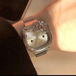 Elegant Hello Kitty watch in rose gold. Features a pink jeweled bow and mesh band.