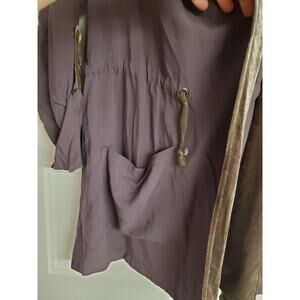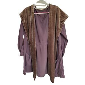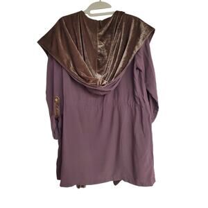 Excellent condition, women's Hem & Thread lightweight, purple jacket with velour trim and hood. This jacket has pockets and is adjustable at the waist. This is an open jacket, it doesn't button or zip close. This material doesn't stretch.