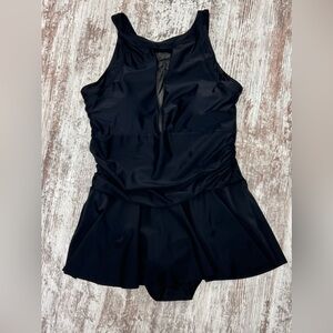 DaiyuLin Women's One Piece Swimdress, Retro High Neck, with flirty mesh slit at bust, open back that tie, skirted swimsuit. Removable pads. Attached panty underneath.