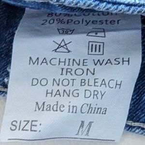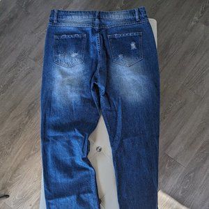 Stylish high rise jeans featuring a distressed design with unique patches. Perfect for a trendy, casual look.