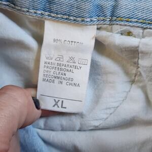 These women's high rise short jean shorts in size 2 (tag says XL but they fit more like a 2 or 4) feature a light blue distressed wash, making them perfect for casual occasions. Made from a blend of polyester and cotton denim, these shorts have a zip closure, flat front, and a 5-pocket design. The regular fit and cut-off style offer a trendy and comfortable look, while the high rise waist adds a touch of sophistication. Ideal for a stylish and laid-back summer wardrobe, these shorts are a must-have for any fashion-forward woman. Good condition.