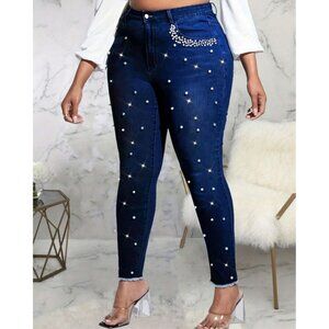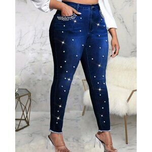 Women's High Rise Skinny Jeans Cotton Stretch Pearl Rhinestones Casual Dressy