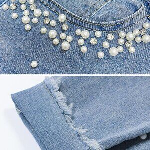 Women's High Rise Slim Fit Denim Jeans Pearl Beaded Frayed Fringe