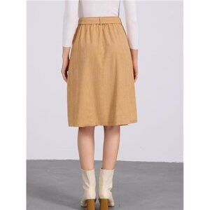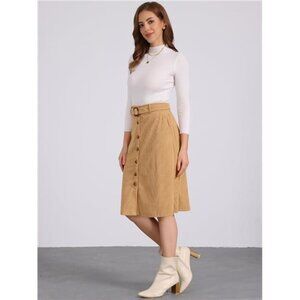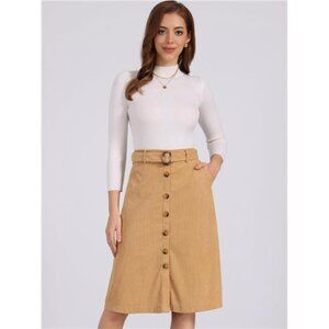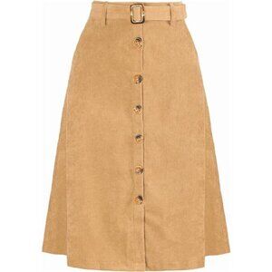 Corduroy Fabric, Tie Waist, A-Line, High Waisted, Elastic Waist at Back, Slant Pockets, Skirt with Buttons, Belt Loops, Midi Length It flatters with elastic waist and belted detail create an a-line silhouette to highlight your curves; Featuring a classic button-front closure, this A-line skirt adds a touch of retro charm to your outfit, while the included adjustable belt lets you customize the fit to your liking Relaxed Fit, Suitable For Daily Wear, Coffee Date, Office, Dating, Holiday Party, etc; This corduroy skirt is a wardrobe workhorse, seamlessly transitioning from casual daytime outings to dressier evening occasions; Pair it with a tucked-in knit sweater and ankle boots for a cozy fall brunch with friends, or layer it with a leather jacket and a graphic tee for a chic weekend errand run Machine Wash Cold with Like Colors, Low iron, Do not bleach, Do not Tumble Dry