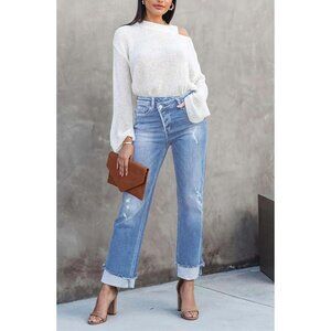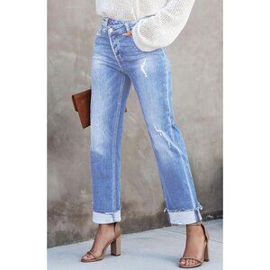 Features: High waisted, wide-leg silhouette with a relaxed fit that flatters various body shapes. Zipper and button closure, four functional pockets including two flap pockets add a cool, utilitarian vibe. Slight distressing for an edgy touch. Stretchy fabric blends cotton, polyester, and elastane for all-day comfort. Tummy control design helps with shape and fit.