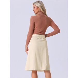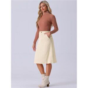 It features a stretchy elastic back panel that adapts to your body shape, ensuring a snug yet flexible fit that moves with you, whether you’re sitting at a holiday dinner or running winter errand; Crafted with an A-line silhouette that flares gently from the waist to the midi hem, this corduroy skirt flatters every body type by balancing proportions and smoothing curves