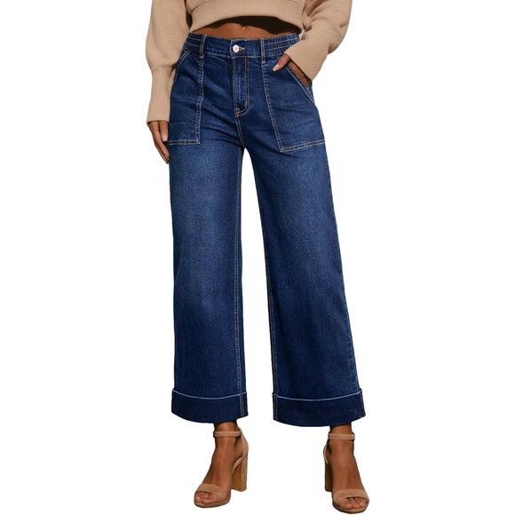 Women’s High Waist Wide Leg Cropped Stretchy Denim Jeans Pockets