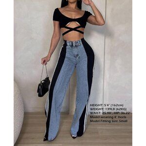 Womens High Waisted Wide Leg Stretch Denim Pants Color Block Casual