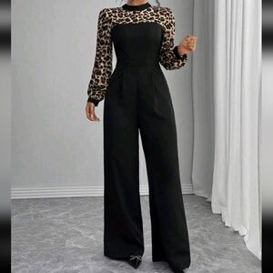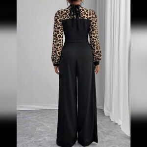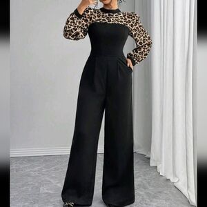 Women's High-Waist Leopard Patchwork Wide Leg Jumpsuit, High-End Elegant Lady