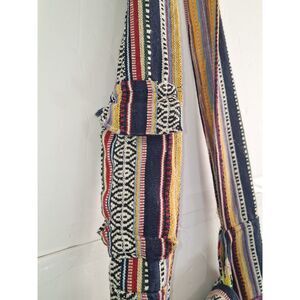 I can't find a brand name on this piece but it is made in India. This has that type of thick colorful cotton material they use for clothing and such. This guy is cute and unique. The closure flap is his face and has a snap on the back of it. His feathers are all different materials with many different colors and patterns. The strap is wide and very long with a pocket on one side. The inside is one large pocket with a smaller zippered one on the back interior. This piece is in very nice pre owned condition.