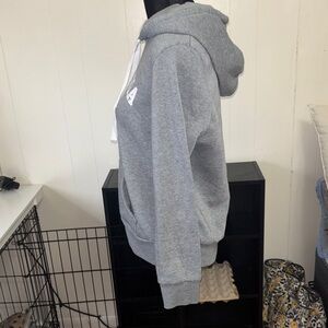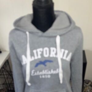 Cozy gray hoodie with California print. Features drawstring hood and front pocket.