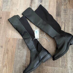 Complete your polished look with these Hope Boots with Memory Foam Insole from A New Day™. These closed round-toe boots have a classic black upper with a distinctive higher front shaft and a slightly shorter back shaft. Set on a cushioned memory foam insole and flocked outsole, these medium-width boots provide a subtle 1.5-inch block heel and elongating 21-inch shaft. Plus, they're finished with a side zipper closure for easy on and off.