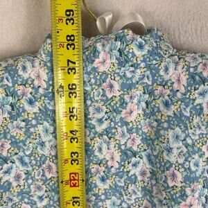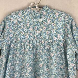 This handmade blue floral women's house coat features a high neckline, short sleeves, and a button closure. The pleated accents and comfortable, modest design make it perfect for lounging or sleeping. Made with a lightweight material, this gown is ideal for wearing in the summer, fall, or spring seasons. With a touch of 80s and 90s style, this cozy and stylish house coat is a great addition to any woman's wardrobe, especially for those who enjoy a granny core or grandma-inspired look.