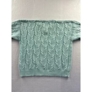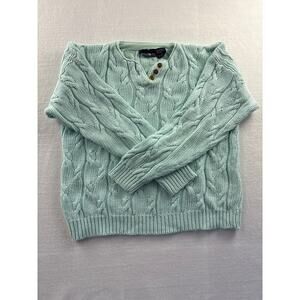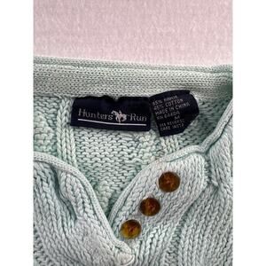In the gentle embrace of a chilly day, this Hunters Run sweater offers warmth and comfort. Its mint hue evokes memories of serene pastures, while the cable knit pattern weaves a tale of timeless elegance. With amber buttons adding a touch of rustic charm, it's an invitation to cozy moments.