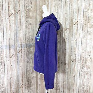 Hurley long sleeve pull over hooded sweatshirt. Purple with large colorful printed brand name on front. Large colorful printed logo on right side of hood. Metal decoration with brand name on ends of hood drawstrings. Size large. 60% Cotton, 40% Polyester. Flat lay approximate measurements: Armpit to armpit - 18" Shoulder to hem - 22.25" Some fading and pilling. Tiny discoloration by hood drawstring and slight discoloration on upper right arm (see photos). Pre-owned condition. From a smoke free home.